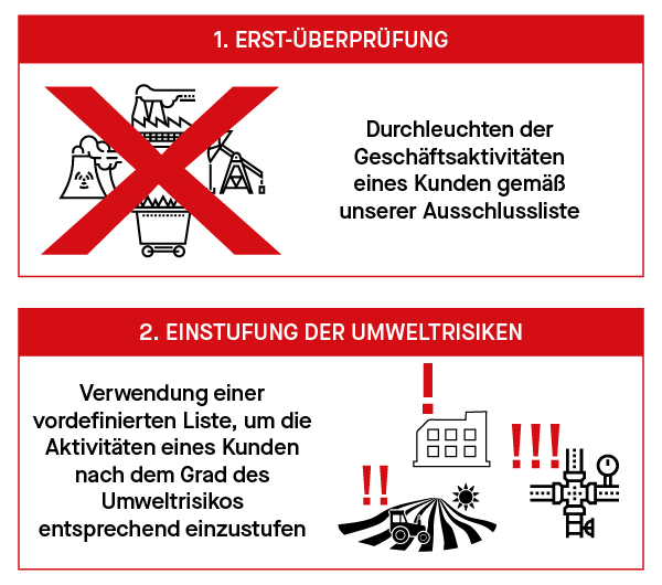 Wir stellen dies sicher, indem wir die folgenden Maßnahmen ergreifen, die Teil unseres Ansatzes zur Bewältigung von ökologischen und sozialen Risiken bei der Kreditvergabe sind: