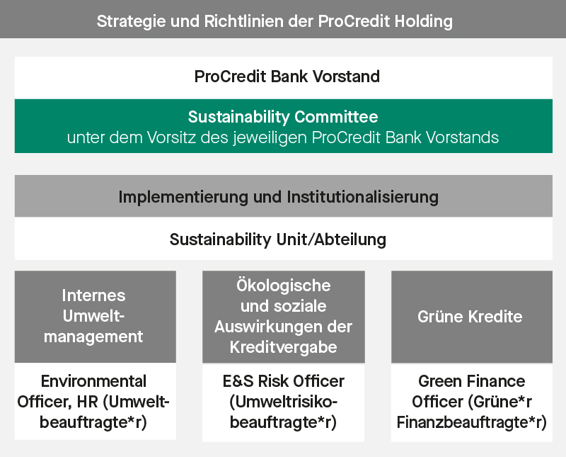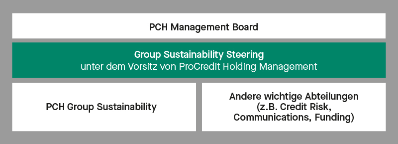 Wie die folgenden Grafiken zeigen, werden strategische Entscheidungen bezüglich des UMS auf Gruppenebene durch das Group Sustainability Steering Committee getroffen und vom gruppenweit agierenden Sustainability Managementteam umgesetzt. Durch dieses Verfahren wird die Einführung und der Ausbau des UMS in allen unseren Banken vereinfacht. Auf Bankebene sind die einzelnen Environmental Committees für alle strategischen Entscheidungen verantwortlich. Für jede der drei Säulen setzen die einzelnen Banken entsprechende Koordinator*innen ein, um so für die vollständige institutionelle Verankerung des UMS zu sorgen.